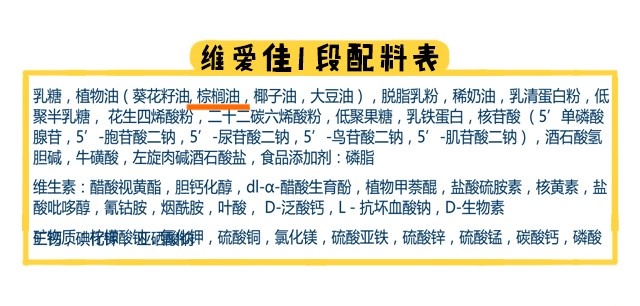 最后在原料方面,大家要注意一下棕櫚油這個成分,棕櫚油有兩個壞處,一是會影響寶寶對鈣的吸收,二是會使大便變硬,增加便秘幾率。