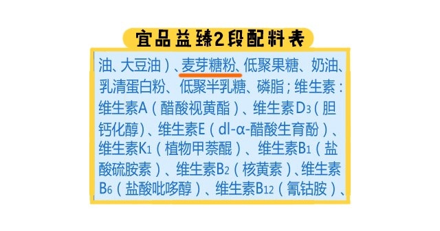 最后在原料方面,益臻2段之后添加了麥芽糖粉,麥芽糖粉的添加會降低碳水化合物中乳糖的占比,而麥芽糖粉的營養價值沒有乳糖那么高。