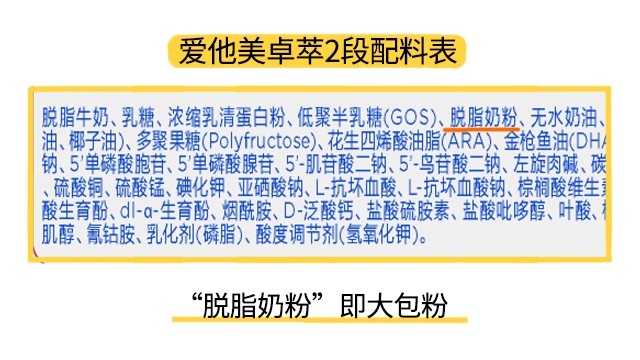 至于特色強化配方,它指的是一些奶粉商家宣傳自家產品特別添加進去的,區別于其他品牌的營養素。愛他美卓萃全部段數是添加了益生元組合(低聚半乳糖+多聚果糖)和天然乳脂。