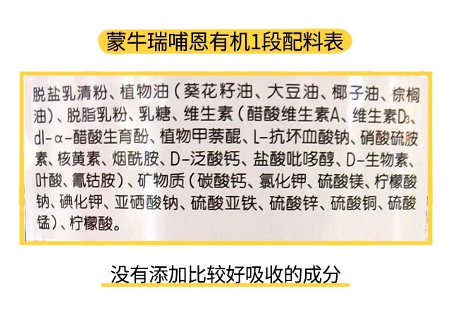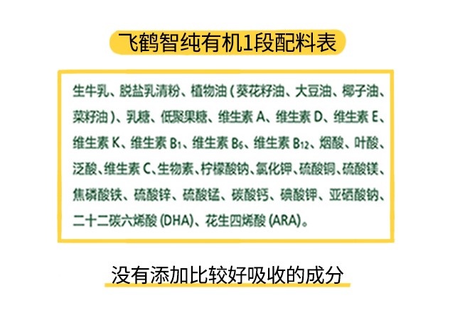 從配料表來看,飛鶴智純有機和蒙牛瑞哺恩有機全部段數都沒有添加比較好吸收的成分。