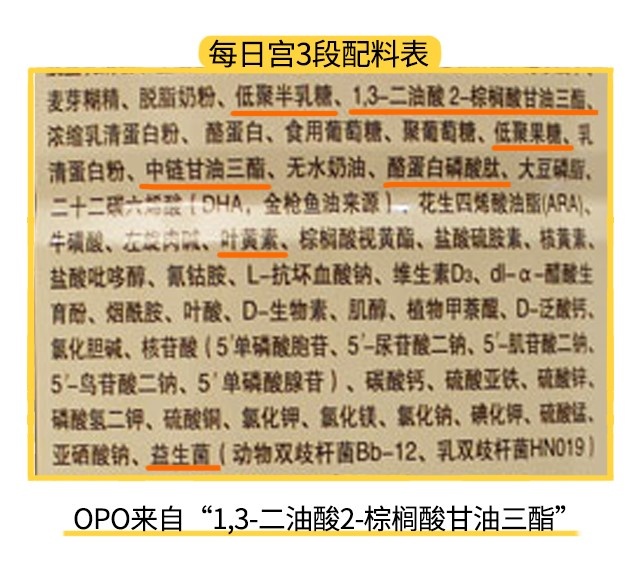 至于特色強化配方,它指的是一些商家宣傳自家奶粉特別添加進去的,區(qū)別于其他品牌的營養(yǎng)素。每日宮的特色強化配方十分多,各段數(shù)是添加了OPO、中鏈甘油三酯、水解蛋白、酪蛋白磷酸肽、益生菌、益生元組合(聚葡萄糖就+低聚果糖)和葉黃素。
