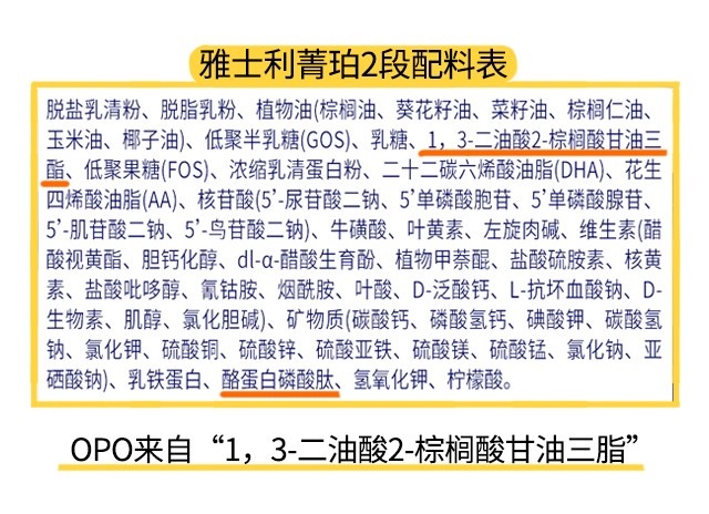 那么說回奶粉本身,菁珀各段數所添加的OPO和酪蛋白磷酸肽分別在脂肪和蛋白質方面是比較好吸收的成分。
