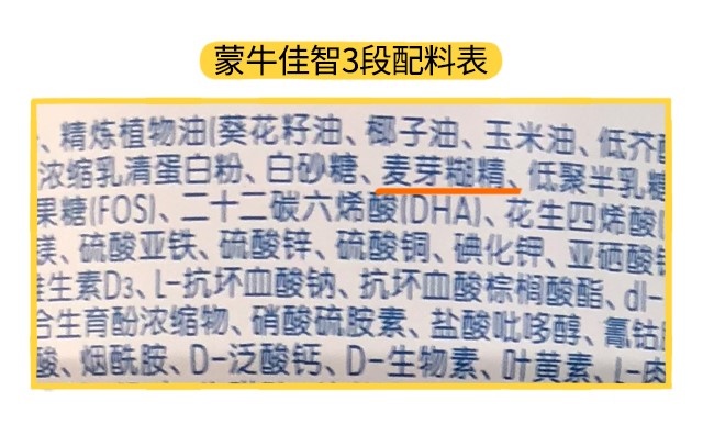 從配料表可以看出,蒙牛佳智2段之后都含有麥芽糊精,麥芽糊精是個很好吸收的碳水化合物。