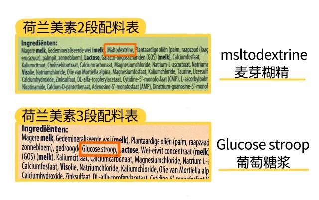 從配料表來看,荷蘭美素1、2段和荷蘭牛欄4段之后(即適用于1歲以上寶寶)的奶粉均添加了麥芽糊精,此外,荷蘭美素3段將麥芽糊精換成了葡萄糖漿,麥芽糊精和葡萄糖漿都是很好吸收的碳水化合物。