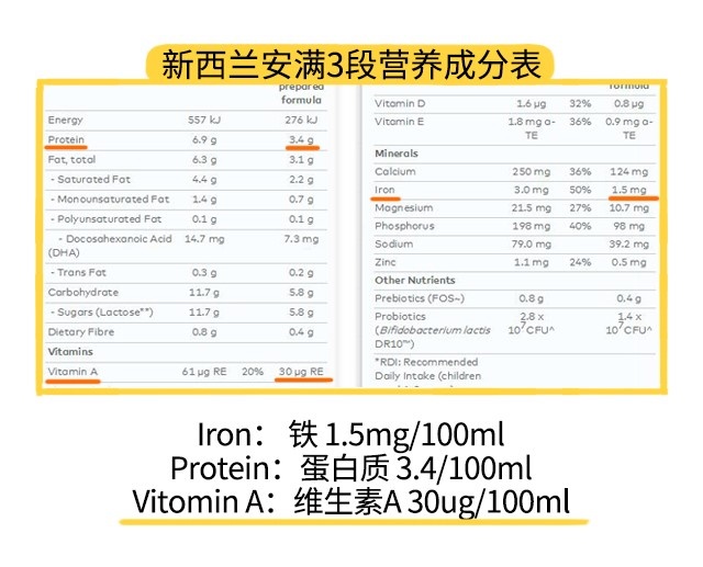 分析完奶源,接著繼續看看營養這塊,這里我會分為基礎營養和強化配方兩方面。基礎營養包括碳水化合物、脂肪、蛋白質、維生素和礦物質。因為國外寶寶的飲食習慣與我們中國寶寶不同,大家制定的奶粉營養標準也不同,國外奶粉經常會有些基礎營養含量與國標不符的情況出現,新西蘭安滿3段也有這種情況,