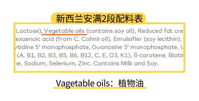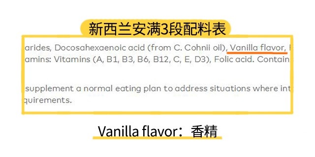 最后在原料方面,新西蘭安滿1段和2段都含有植物油,而又沒有標注具體種類,所以很有可能含有棕櫚油,此外3段含有香精。
