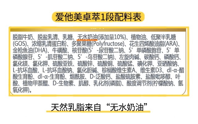 愛他美卓萃和德愛白金的情況十分接近,各段數均添加了天然乳脂,天然來源的乳脂含有優化的脂肪酸結構,有助脂肪酸更完整的被寶寶吸收,同時幫助減少鈣皂生成,提高了鈣的吸收率。