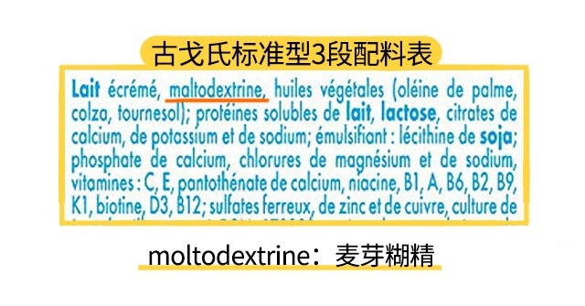 從配料表來看,古戈氏標準型1段和2段都沒有添加比較好吸收的成分,3段含有麥芽糊精,麥芽糊精是很好吸收的碳水化合物。