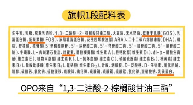 至于特色強化配方,它指的是一些商家宣傳自家奶粉特別添加進去的,區別于其他品牌的營養素。旗幟各段數是添加了OPO、益生元組合(低聚半乳糖+低聚果糖)、葉黃素、乳鐵蛋白和a-乳清蛋白。