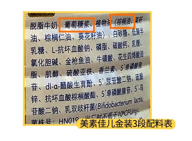 美素金裝各段數也含有棕櫚油,此外,美素金裝1段和2段添加了麥芽糊精,3段和4段則添加了葡萄糖漿,麥芽糊精和葡萄糖漿的添加目的十分接近,兩者都是很好吸收的碳水化合物。