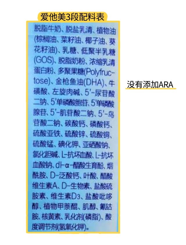 我翻閱了愛(ài)他美各個(gè)段數(shù)的配料表,這款奶粉3段和4段都沒(méi)有添加ARA,一般在我的奶粉評(píng)測(cè)文章中都會(huì)提到6項(xiàng)常規(guī)強(qiáng)化配方,常規(guī)強(qiáng)化配方指的是一些國(guó)標(biāo)沒(méi)有規(guī)定必須要添加,但基本上每款普通奶粉都會(huì)有的營(yíng)養(yǎng)素,所以我歸類為常規(guī)強(qiáng)化配方,ARA就是6個(gè)常規(guī)強(qiáng)化配方之一,它可以促進(jìn)寶寶大腦神經(jīng)系統(tǒng)的發(fā)育,有助提高思維和記憶力。