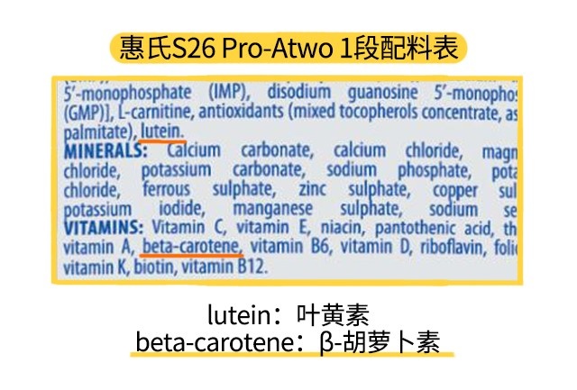 那么在特色強化配方這塊,特色強化配方指的是一些商家宣傳自家奶粉添加進去的,區(qū)別于其他品牌的營養(yǎng)素。惠氏S26 Pro-Atwo各段數(shù)是添加了A2-β酪蛋白、葉黃素和β-胡蘿卜素。