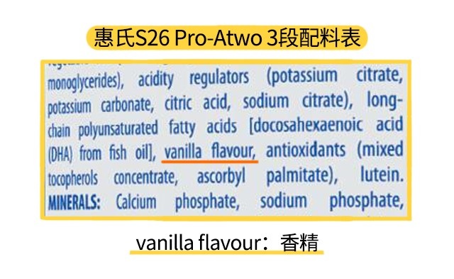 營養(yǎng)和奶源都分析完了,最后是原料方面,惠氏S26 Pro-Atwo 1段和2段比較好,沒有添加需要特別注意的成分,不過3段含有香精,香精會增加奶粉的香味,挑起寶寶的食欲,長期下來容易使寶寶對口味產(chǎn)生依賴導(dǎo)致偏食。