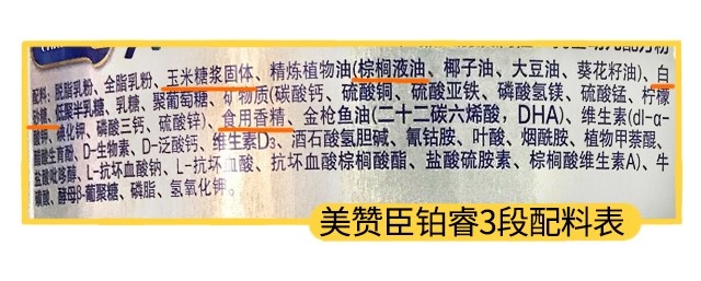 說完奶源的缺點,接著說說原料,鉑睿全部段數都含有棕櫚油和玉米糖漿。棕櫚油可以提供母乳中富含的棕櫚酸,但棕櫚油的棕櫚酸容易與鈣產生皂化反應,形成鈣皂,影響寶寶對鈣的吸收,還會使大便變硬,增加便秘的幾率。玉米糖漿的添加一般是為了減少乳糖的添加量從而降低生產成本,但玉米糖漿除了提供能量外沒太大營養價值,而乳糖是寶寶非常重要的碳水化合物營養來源,對寶寶器官、消化系統等方面的發育起到促進作用。