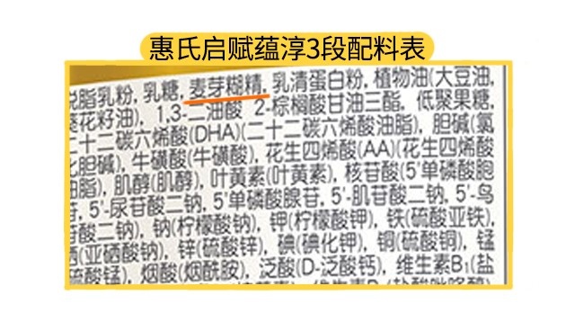 除了香精,啟賦蘊淳3段和4段還額外加入了麥芽糊精,麥芽糊精雖不是什么有害成分,但它的添加會降低奶粉中乳糖的占比,乳糖是寶寶十分重要的碳水化合物營養來源,對寶寶器官、消化系統的發育有促進作用,而麥芽糊精除了可以提供能量外,沒什么營養價值。