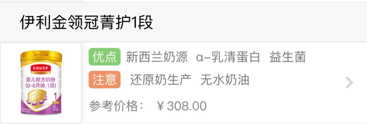 金領冠菁護奶粉在2018年面世,它是伊利購買新西蘭大包粉到國內重新兌水成還原奶之后制成的奶粉,因為大包粉的放置時間不那么明確,加上之后還要經過運輸、兌水等等工序,使得奶粉更容易受到二次污染,而且在生產過程中所流失的營養素也比較多。還有,菁護的奶基中含有全脂奶粉,牛乳脂肪的體積稍大,對小月齡寶寶的不是太好消化吸收,等寶寶月齡大一些,我們就不用擔心這個問題。