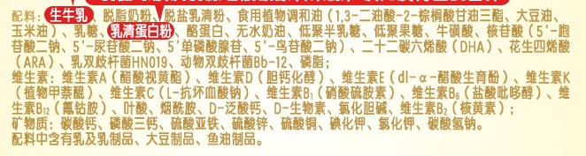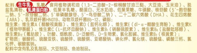 珍護各段數奶基在鮮奶(生牛乳)的基礎上,摻入了大包粉(脫脂乳粉)兌水的還原奶,還原奶經過二次加工。因此降低了奶粉的新鮮度和營養保留度。