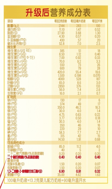 睿護3個段數的基礎營養添加量都符合中國國標的規定,基礎營養包括維生素、礦物質、碳水化合物、蛋白質、脂肪。至于6個常規強化配方里面,DHA是大家比較關注的一項,經過換算,睿護3個段數DHA添加量分別是2.60mg/100kj、3.09mg/100kj、1.03mg/100kj,當中1段和2段的DHA含量比市面奶粉的平均水平高一些,3段則沒有達到平均水平。