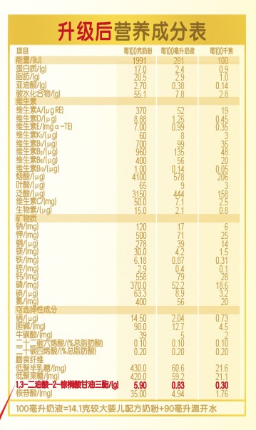 營養方面,珍護1-3段是6個常規強化配方齊全,4段只有5個,缺少了核苷酸。此外,珍護4個段數均添加了益生菌(乳雙歧桿菌、動物雙歧桿菌)、OPO(1,3-二油酸-2-棕櫚酸甘油三酯)、益生元組合(低聚半乳糖+低聚果糖)、α-乳清蛋白(來源于乳清蛋白粉)、MFGM乳脂球膜(來源于乳清蛋白粉)、乳源唾液酸(來源于乳清蛋白粉),珍護4段還額外加入了葉黃素。這些營養素對寶寶腸道、吸收、認知能力、視力發育等方面起到促進作用。