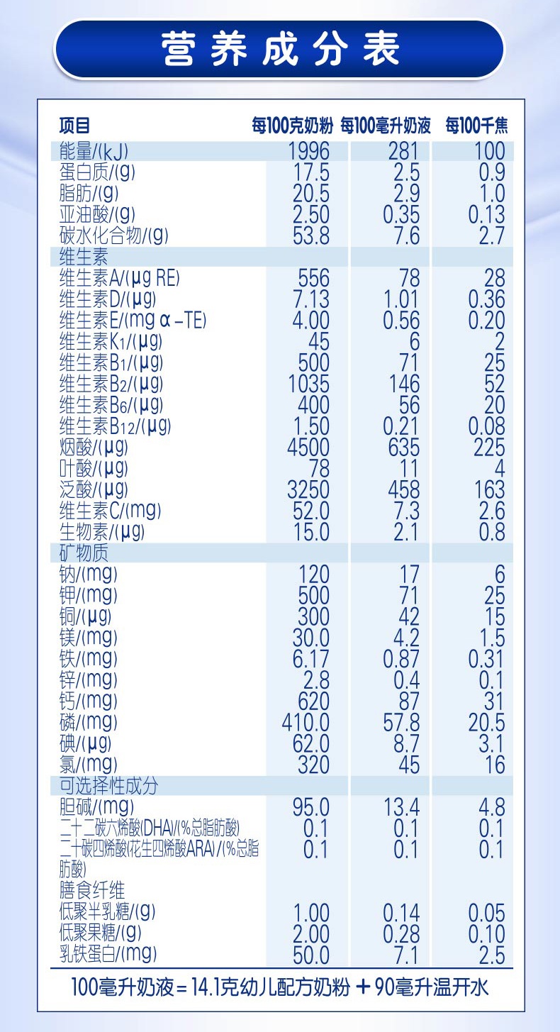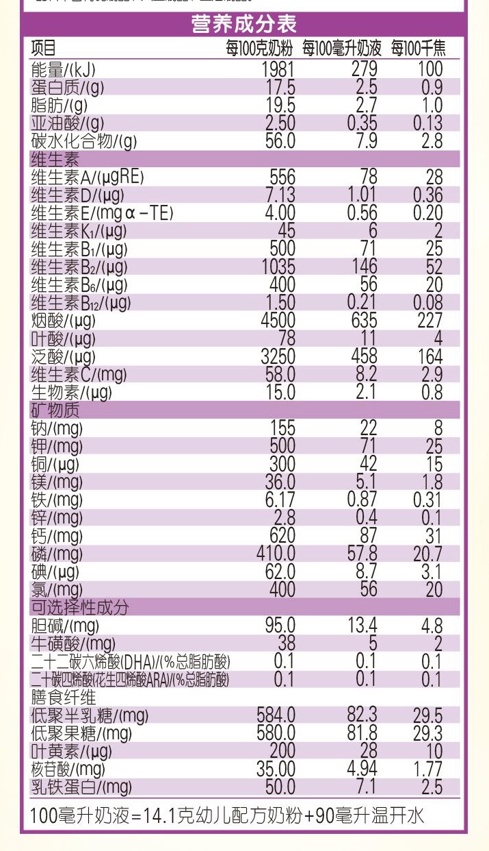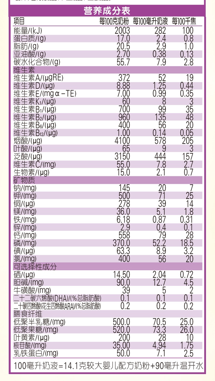 菁護3個段數的基礎營養添加量均符合中國國標的規定,基礎營養包括維生素、礦物質、碳水化合物、蛋白質、脂肪。至于6個常規強化配方中,我著重說說大家比較關注的DHA,經過換算,菁護3個段數DHA含量分別為2.62mg/100kj、1.02mg/100kj、0.98mg/100kj,其中1段的DHA含量高于市面奶粉的平均水平,2段和3段比平均水平少一些。