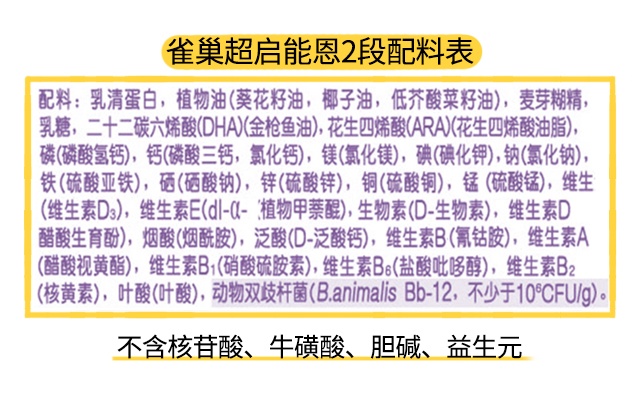 但市面上添加有益生菌的奶粉非常多,相比之下,超啟能恩這個賣點沒太大優勢。而且在DHA、ARA、核苷酸、?;撬?、膽堿、益生元這6項國標沒有規定必須要添加,但絕大部分普通奶粉都會有的常規強化配方中,超啟能恩1段只占5個,缺少了益生元,2段和3段更少,只有2個,缺少了牛磺酸、膽堿、核苷酸、益生元。