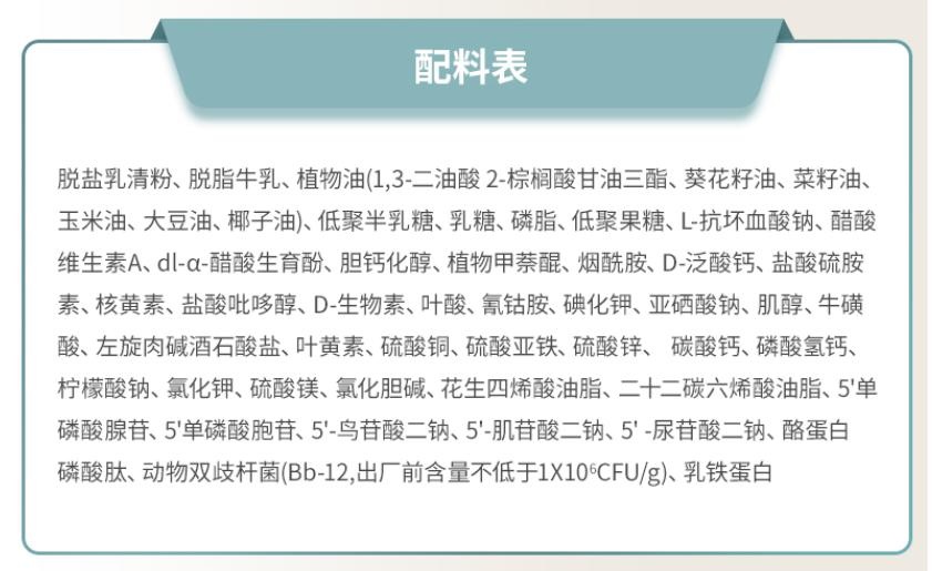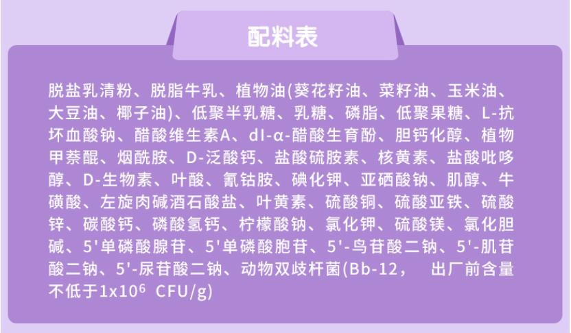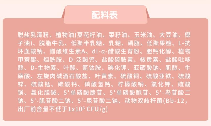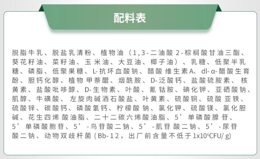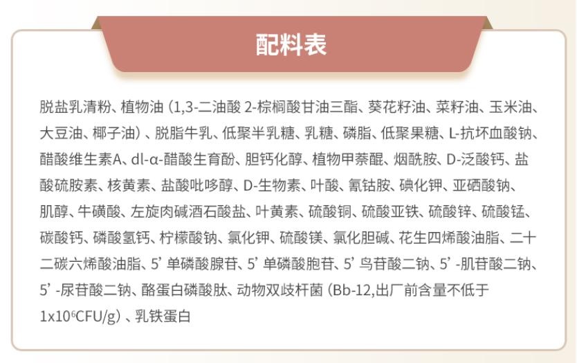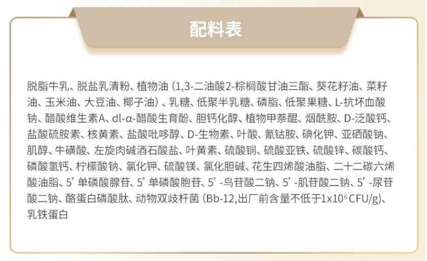 營養方面,樂享1-3段都是核苷酸、DHA等等6個常規強化配方齊全。此外,樂享各段數還添加了6個特色強化配方,分別是OPO(1,3-二油酸-2-棕櫚酸甘油三酯)、葉黃素、酪蛋白磷酸肽、乳鐵蛋白、益生元組合(低聚半乳糖+低聚果糖)、益生菌(動物雙歧桿菌),這些營養素在寶寶便秘、視力發育、吸收、免疫力、腸道等方面均起到積極作用。