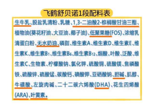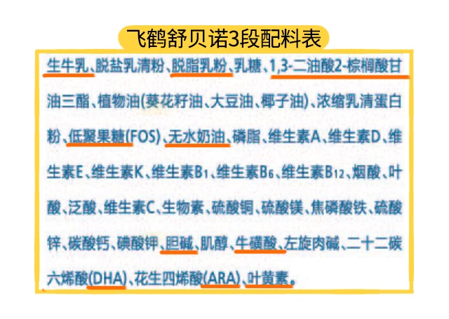 看配方其實主要就是看奶粉罐上的配料表和營養成分表,通過這些信息,我們可以判斷出一款奶粉使用了什么奶基料、添加的營養配方是哪些,以及是否含有對寶寶成長發育沒什么益處的原料成分。接下來各位先看看舒貝諾1-3段奶粉罐上的配料表。營養成分表,其中一些要重點關注的成分我都標注好了,大家要留意。
