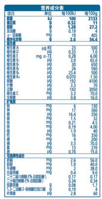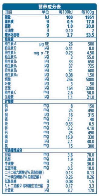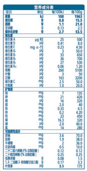 舒貝諾常規強化配方含量(單位:mg/100kj) |