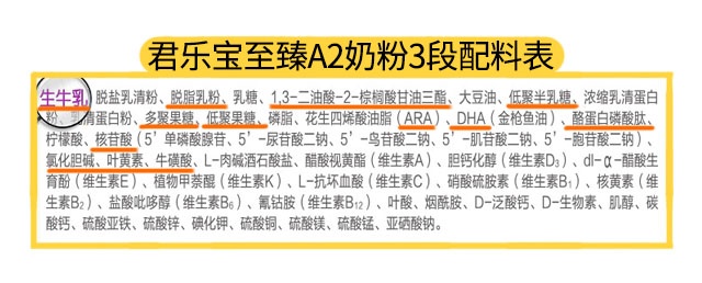 說完奶基料,接著說說營養配方,像DHA、ARA、?;撬?、核苷酸、膽堿、益生元(低聚半乳糖/低聚果糖/多聚果糖)這6個配方是國標沒有規定必須要添加,而市面上很多普通奶粉都會添加的營養素,被我歸類為常規強化配方,從上面的圖片中看到,至臻A2奶粉3個段數都是6項常規強化配方齊全,下面我簡單說說這些配方的好處。