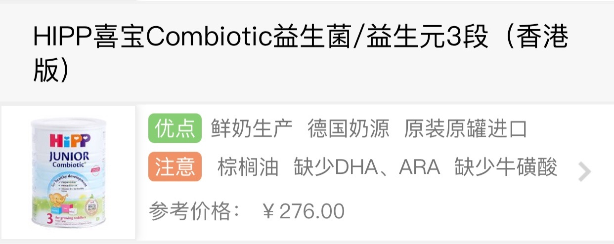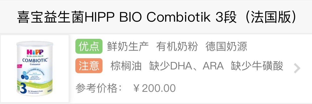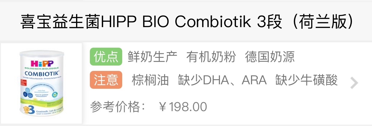營養方面,喜寶倍喜3段只添加了益生元這個常規強化配方,缺少了牛磺酸、核苷酸、膽堿、DHA、ARA。并且3段也沒有添加任何特色強化配方。喜寶倍喜又不是有機奶粉,沒有受到有機認證規定的限制(至少要有95%原料來自有機),但是喜寶倍喜的營養配方比很多有機奶粉都要少,表現真心差。