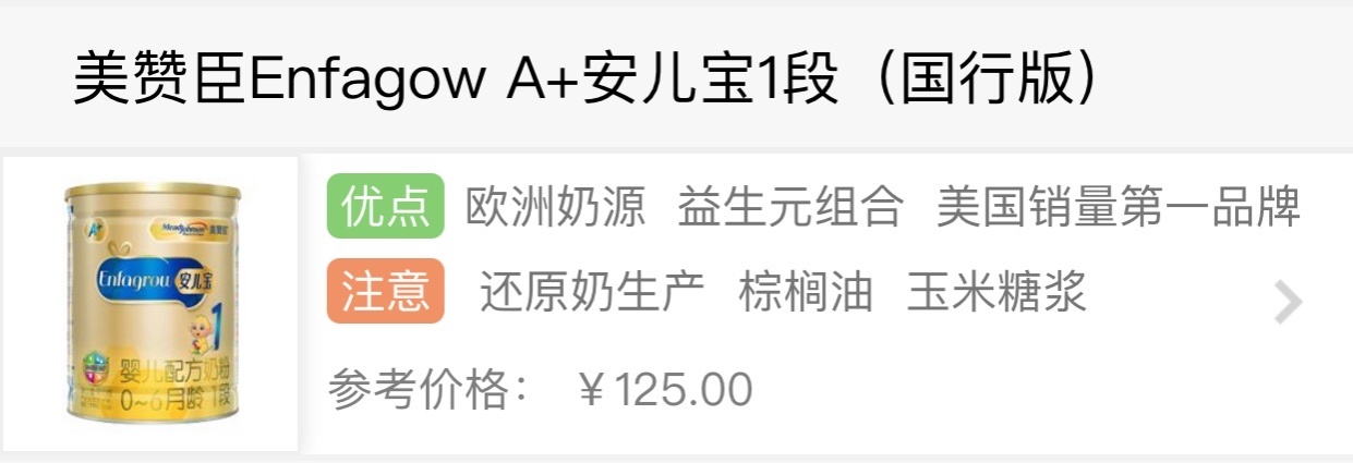 原料這塊,大家要注意一下,A+安兒寶1段含有棕櫚油、玉米糖漿,棕櫚油不但會影響寶寶對鈣的吸收,還會使大便變硬而更難排出,增加了便秘幾率。玉米糖漿沒什么價值,加在奶粉中會降低營養價值更高的乳糖的占比。