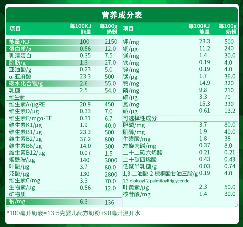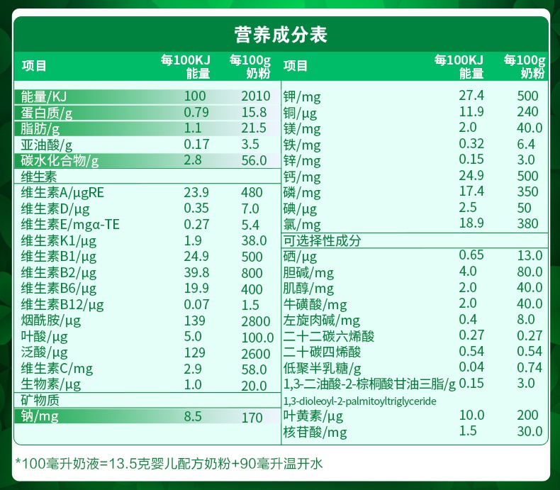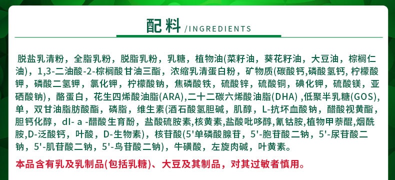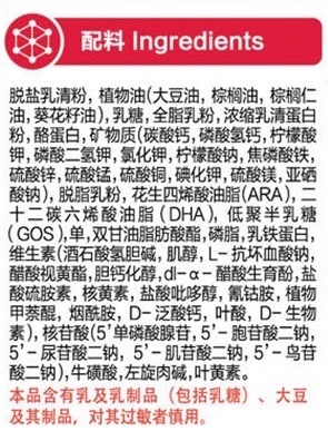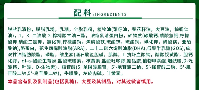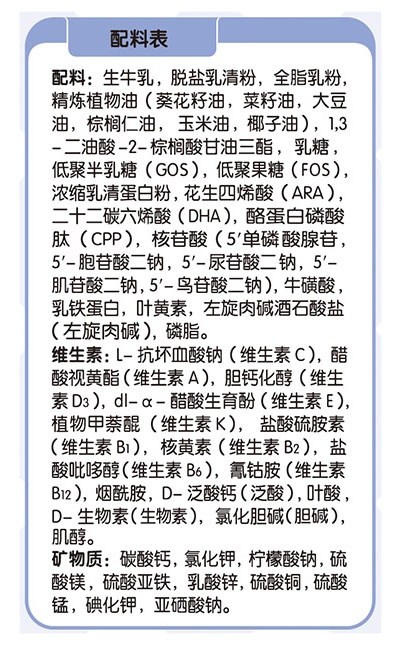 綠愛3個段數(shù)都是使用大包粉(全脂乳粉、脫脂乳粉)兌水而成的還原奶來生產(chǎn),還原奶的加工工序比較繁瑣,所以奶粉的新鮮度有所欠缺,在生產(chǎn)過程中流失的營養(yǎng)素也比鮮奶多。此外,大家要注意,綠愛奶基中含有全脂乳粉,牛乳脂肪對小月齡寶寶來說可能會比較難消化吸收。