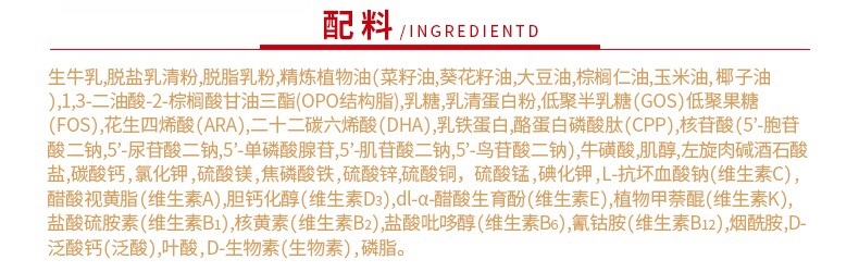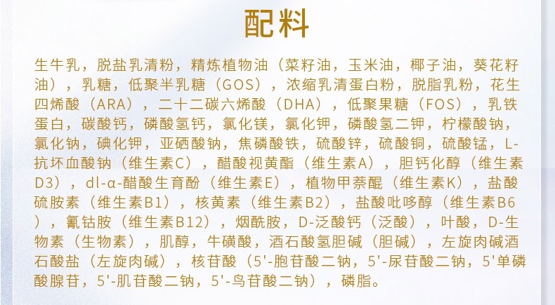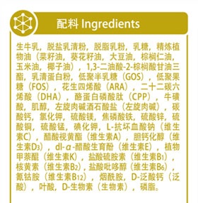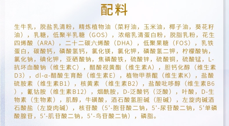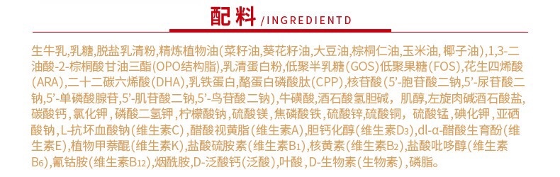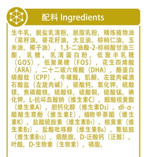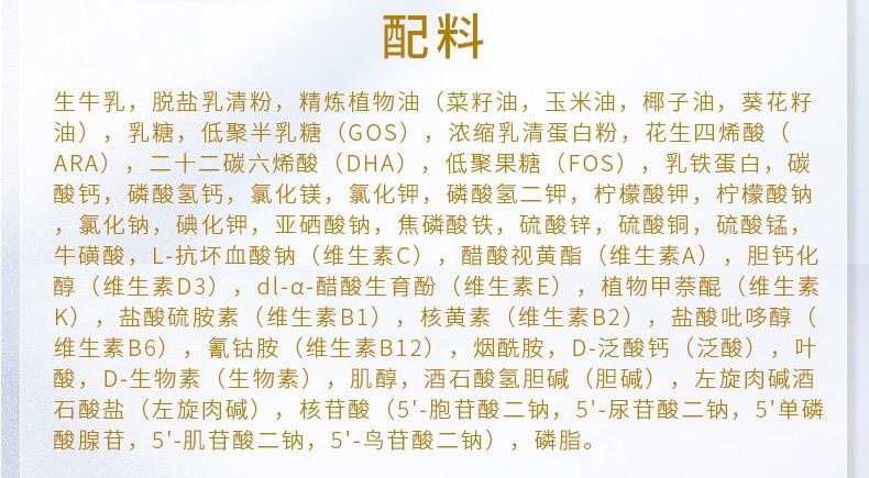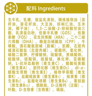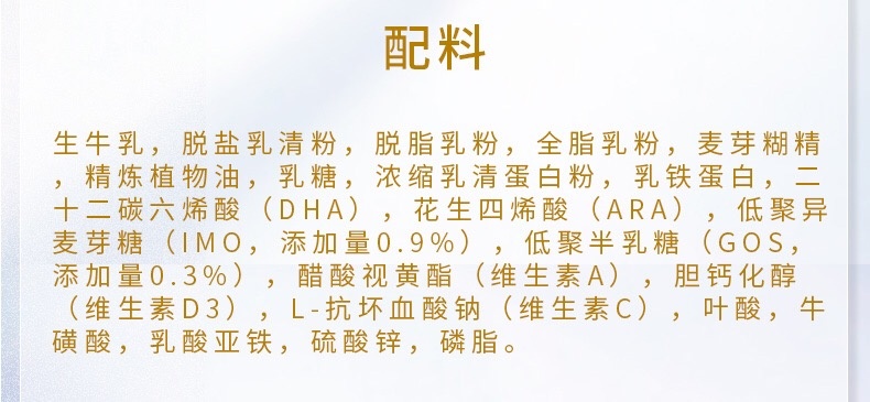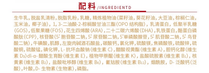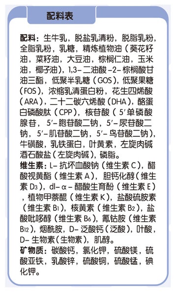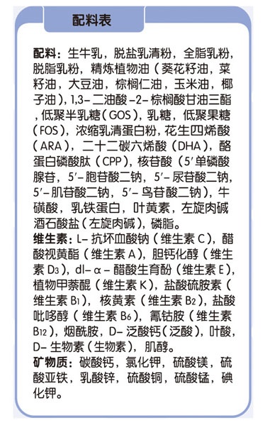 另外,在這3個特色強化配方的基礎(chǔ)上,經(jīng)典優(yōu)選1-3段還額外加入了酪蛋白磷酸肽、乳鐵蛋白,它們在吸收、免疫力等方面有促進作用,而4段是額外加入了對視力發(fā)育有幫助的β-胡蘿卜素。