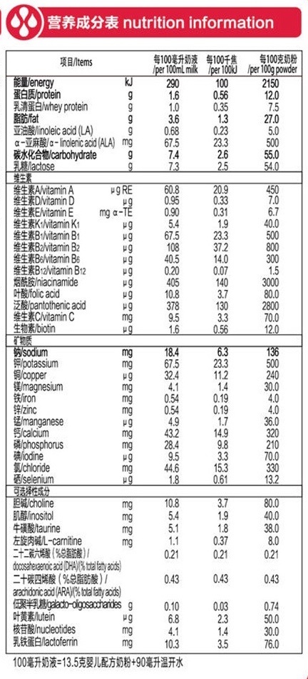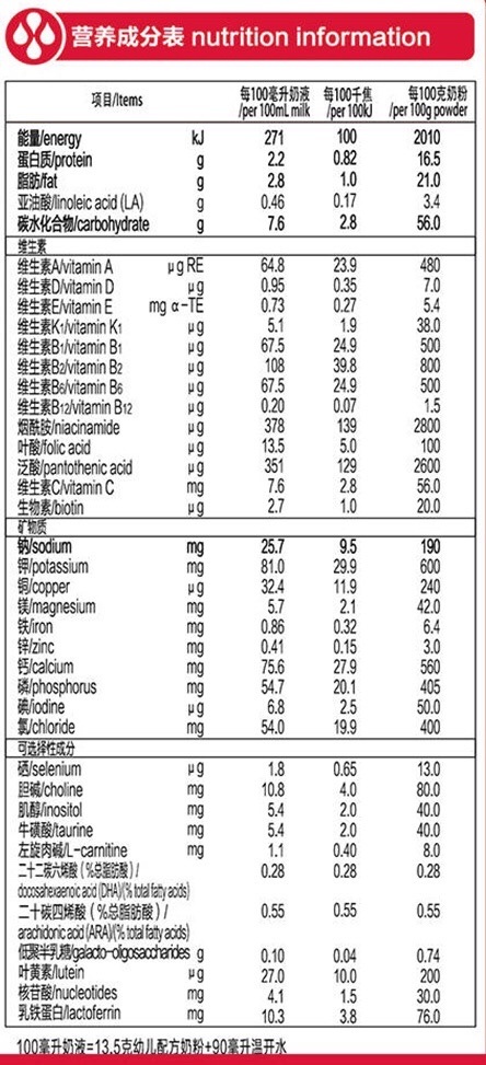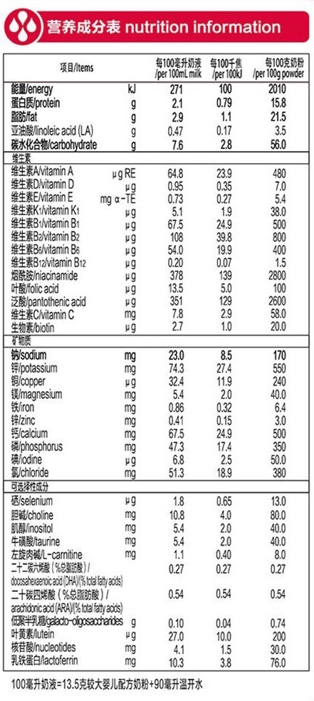 紅愛各段數(shù)的基礎(chǔ)營養(yǎng)含量均符合中國國標(biāo)的規(guī)定,基礎(chǔ)營養(yǎng)包括維生素、礦物質(zhì)、碳水化合物、蛋白質(zhì)、脂肪。至于在6個常規(guī)強化配方中,DHA是大家比較關(guān)注的一項,紅愛3個段數(shù)的DHA添加量分別是4.16mg/100kj、3.30mg/100kj、3.52mg/100kj,3個段數(shù)的DHA含量都市面奶粉的平均水平,多出不少。