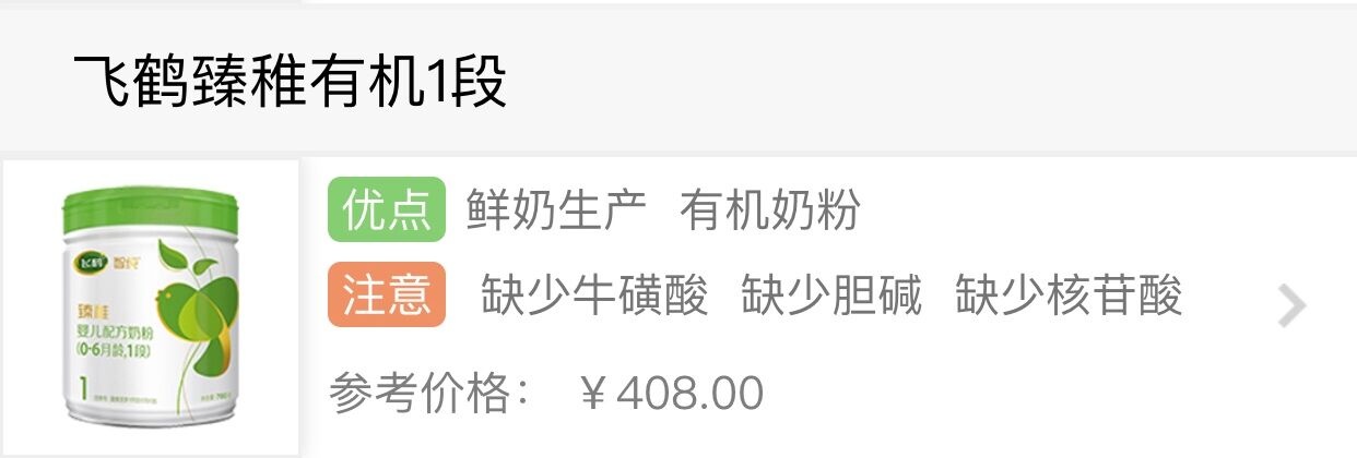 營養方面,有機認證規定奶粉中的原料至少要有95%是來自有機,這就意味著人工合成的營養素就不能過多的添加,在很多普通奶粉都會添加的6個常規強化配方中,臻稚有機1段只添加3個,缺少了牛磺酸、核苷酸、膽堿。此外,臻稚有機1段并沒有添加任何特色強化配方。