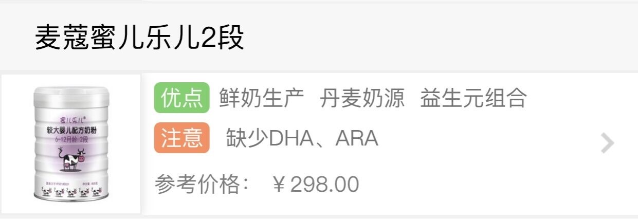 營養方面,在6項常規強化配方中,蜜兒樂兒2段只占4個,缺少了對寶寶思維、記憶力有促進作用的ARA,以及有助大腦發育的DHA,這種情況在市面奶粉中比較少見,如果寶寶食用不含DHA的奶粉,建議大家要要額外給寶寶添加DHA補充劑。同時輔食方面也適當調整一下,給寶寶增加一些富含DHA、ARA的食物,例如雞蛋,豆類,菠菜、海魚,海藻,堅果等等。