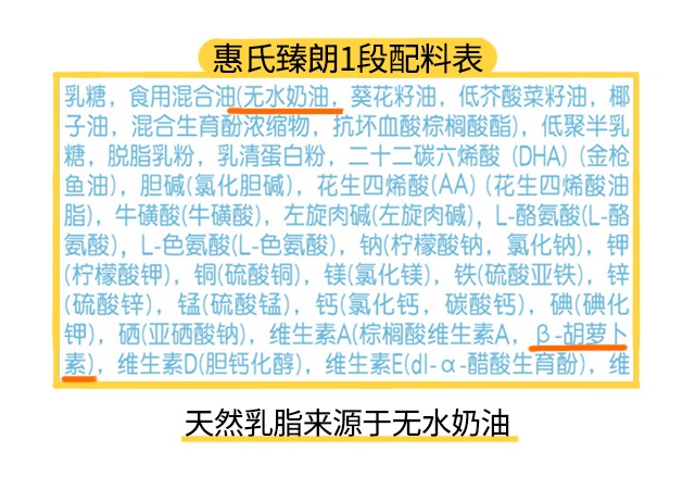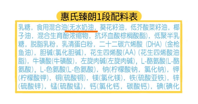 其實惠氏奶粉絕大多數(shù)都像啟賦蘊淳那樣,2段之后添加香精、麥芽糊精什么的,但比較難得的是,臻朗全部段數(shù)均沒有添加棕櫚油、香精、麥芽糊精等成分。不過各位要稍加注意,臻朗原料中含有的無水奶油,無水奶油的添加可以豐富奶粉的脂肪酸種類,但由于它來源于牛乳,剛剛也提到,牛乳脂肪不怎么利于小月齡寶寶的消化吸收。