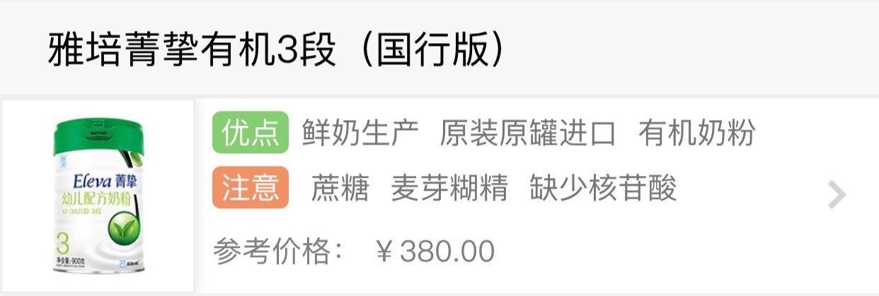 原料方面,菁摯有機3段加入了香精和蔗糖,這樣會使沖出來的奶粉又香又甜,長期食用的話,很可能會使寶寶對口味產生依賴而造成偏食,之后不好接受清淡的食物。