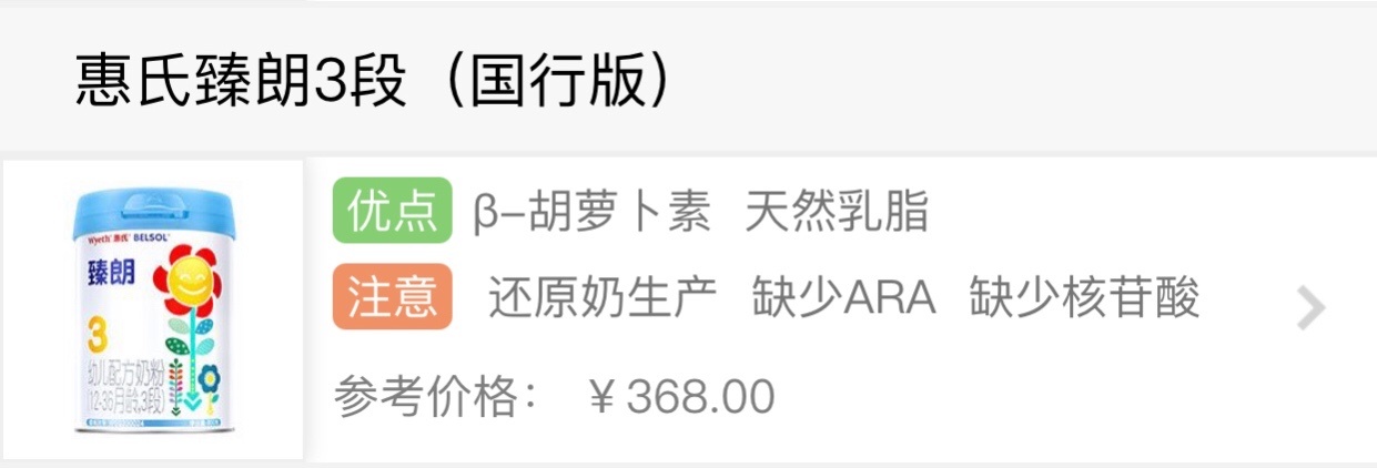 臻朗3段采用新西蘭奶源,新西蘭的奶源品質比較高,但是奶基是大包粉兌水而成的還原奶,還原奶經過二次加工,奶粉不怎么新鮮,生產過程中營養素的流失也比較多。