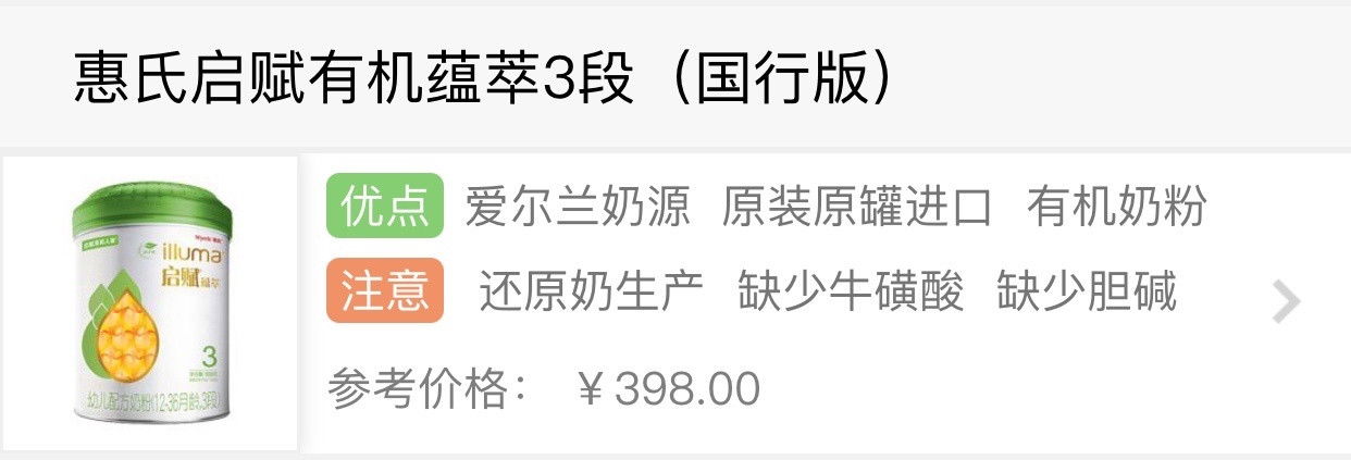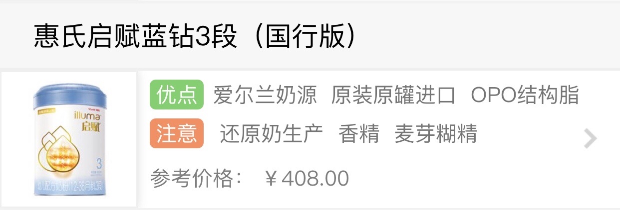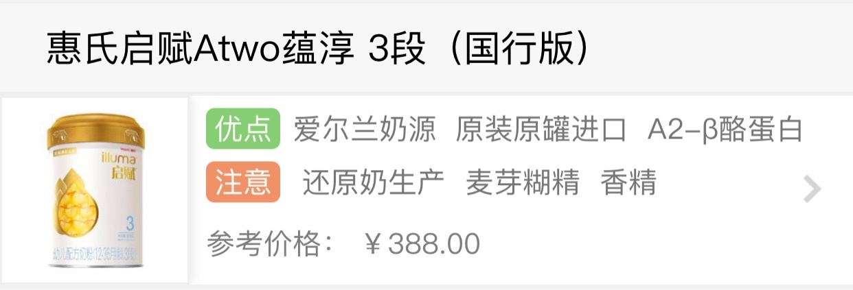 原料這塊,啟賦蘊淳3段加入了麥芽糊精和香精,麥芽糊精的添加通常是為了取替部分乳糖的占比,從而降低成本,但麥芽糊精的營養價值沒有乳糖那么高。香精會加重奶粉的口味,寶寶喜歡喝,但長期使用容易使寶寶對口味生產依賴,之后不太好接受口味比較清淡的奶粉或者食物。