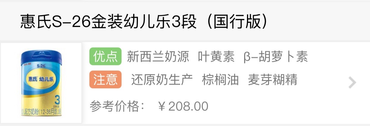 原料方面,S-26金裝3段添加了香精、麥芽糊精、棕櫚油。香精會加重奶粉的口味,能提高寶寶對奶粉的興趣,不過過多食用容易造成寶寶口味上的依賴,之后可能會比較難適應清淡口味的奶粉或者食物。棕櫚油會使寶寶的大便硬化,增加便秘的幾率,而且會影響鈣吸收。