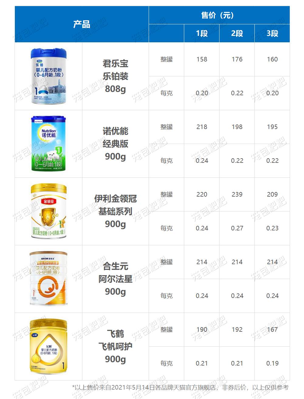 它們分別是:君樂(lè)寶樂(lè)鉑裝,諾優(yōu)能普通版,伊利金領(lǐng)冠基礎(chǔ)系列,合生元阿爾法星,飛鶴飛帆呵護(hù)。