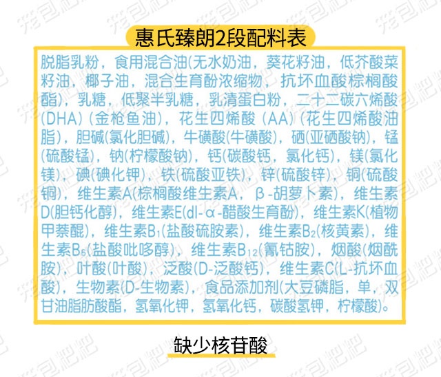 常規(guī)強(qiáng)化配方指的是市面上絕大多數(shù)奶粉都會(huì)添加,但國(guó)標(biāo)沒(méi)有規(guī)定要添加的營(yíng)養(yǎng)素,分別是DHA、ARA、牛磺酸、核苷酸、膽堿、益生元,臻朗 2段只添加了5個(gè)常規(guī)強(qiáng)化配方,缺少了核苷酸,核苷酸有助提高寶寶的免疫力,如果寶寶食用臻朗2段的話,大家要適當(dāng)增加些蔬菜、水果等富含核苷酸的輔食。