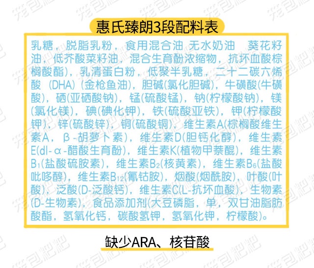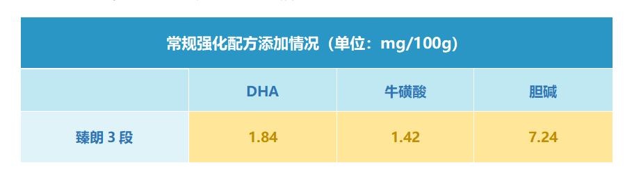 常規(guī)強化配方指的是市面上絕大多數(shù)奶粉都會添加,但國標沒有規(guī)定要添加的營養(yǎng)素,分別是DHA、ARA、牛磺酸、核苷酸、膽堿、益生元,臻朗3段只添加了4個常規(guī)強化配方,缺少了有助提高思維和記憶力的ARA以及對提高寶寶免疫力有幫助的核苷酸,對于這種情況,大家要注意輔食方面的調(diào)整,適當給寶寶增加些富含ARA、核苷酸的輔食,比如蔬菜、水果、雞蛋、魚、豆類等等。