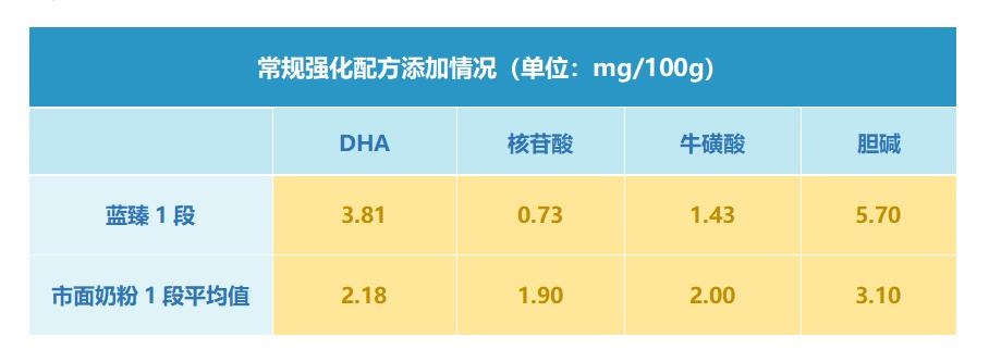 常規強化配方指的是市面上絕大多數奶粉都會添加,但國標沒有規定要添加的營養素,分別是DHA、ARA、牛磺酸、核苷酸、膽堿、益生元,藍臻1段是6個常規強化配方齊全,添加量方面,大家可以看看藍臻1段與市面上1段奶粉的平均添加量對比。