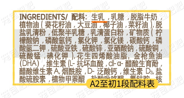 A2至初1段在原料表中標注了所使用植物油的具體種類,分別是:菜花籽油、大豆油、椰子油、菜籽油,沒有添加會影響鈣吸收以及增加便秘幾率的棕櫚油。