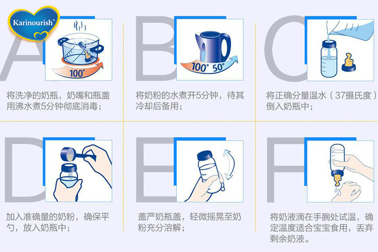 在準備配方前請洗手,哺乳用具要在沸水中消毒。滾水并使其冷卻到哺育溫度(大約攝氏37度)。量好冷卻的適溫開水并裝入消毒過的奶瓶中。用罐中的勺子裝好一勺奶粉,不要積壓,用餐刀刮平多余部分,按照說明加入水中。在50毫升的水中加入一勺奶粉。蓋好奶瓶,搖勻,在喂前請滴一滴在手腕上以測試適當的溫度。