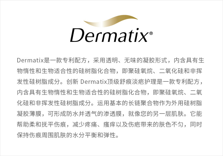 Dermatix 祛疤舒痕膏是一種先進的疤痕修復配方。這種局部外用的硅酮凝膠,被全球很多整形外科醫生、皮膚科醫生和專家推介。