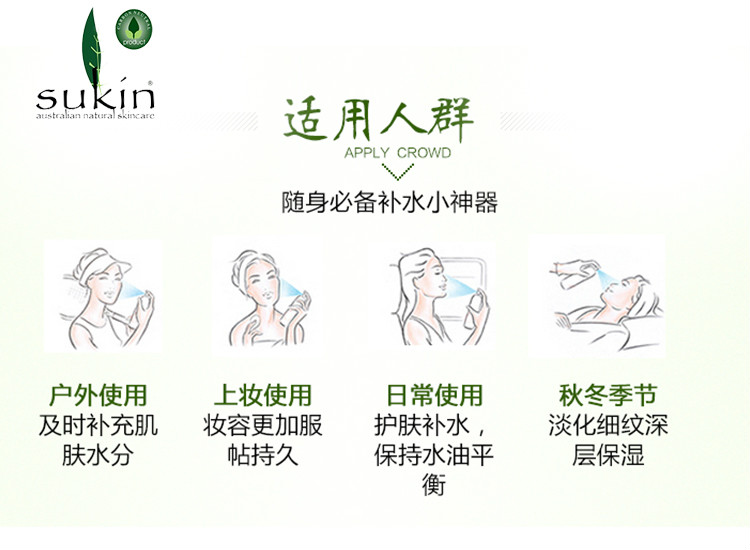 Sukin 純天然保濕噴霧爽膚水,不含酒精,用甘菊與玫瑰香水調(diào)配而成,有助于呵護(hù)疲倦肌膚,改善膚色,并能滋養(yǎng)疲倦肌膚。