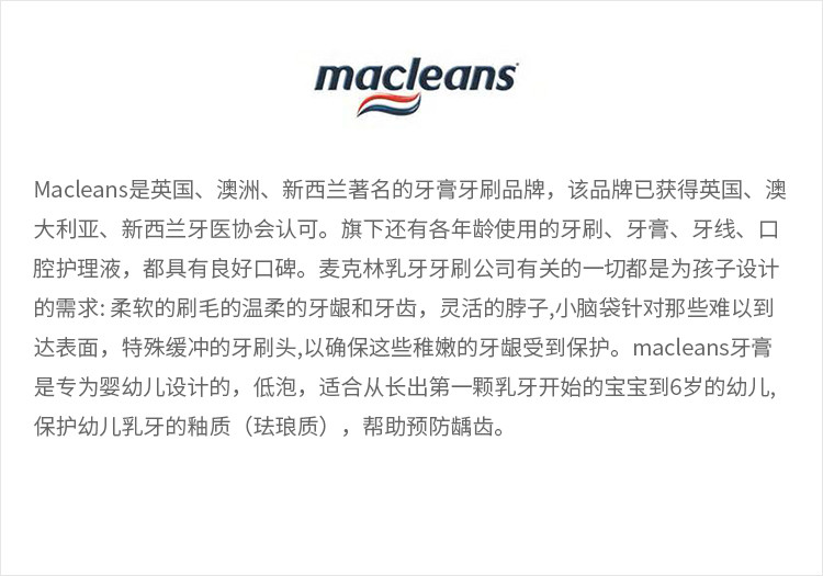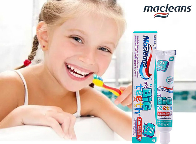 Macleans 低氟兒童牙膏是一款專門為7歲以上兒童牙齒設計的兒童牙膏,其含有氟和鈣,能夠有效地幫助孩子們防止蛀牙,清潔牙齒。